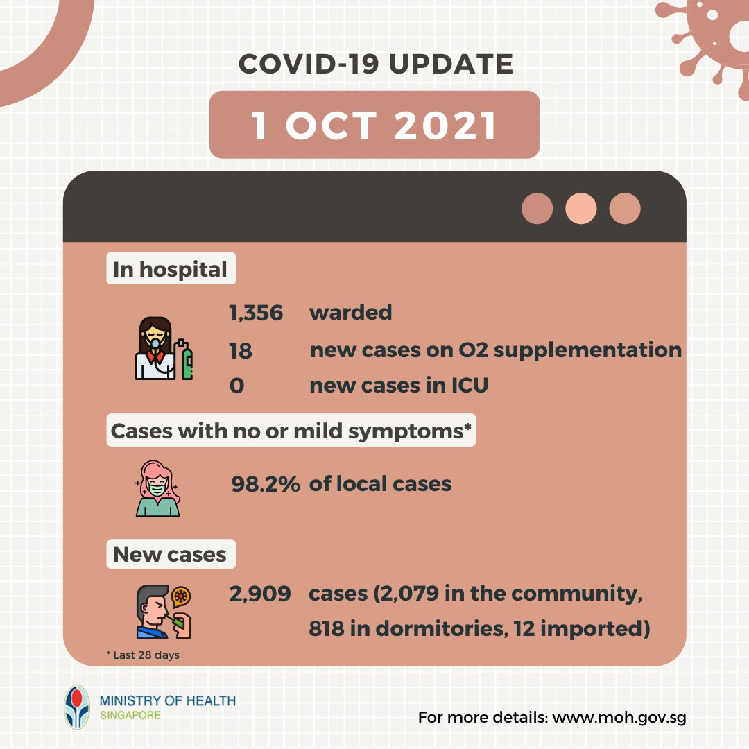 . But this month Singapore and Taiwan have both seen a sudden and aggressive rise in cases - with Singapore logging 248 new cases just last week and Taiwan 1200 local infections. Singapore follows strictly to World Health Organizations case definition for classifying COVID-19 deaths which does not include non-pneumonia fatalities like those caused by blood or heart issues among COVID-19 patients in its official tally. Singapore to Advance COVID-19 Research Collaboration with ASEAN and Strengthen Regional Capabilities to Combat Pandemics- Agency for Science Technology and Research ASTAR. As of 5 Oct 2021 12pm 1512 COVID-19 cases are warded in hospital.Thursday marks the highest daily recorded COVID-19 cases since 1 May last year when 932 infections were reported. 634am Oct 3 2021. There are 247 cases of serious illness requiring oxygen supplementation and 34 in the ICU. SINGAPORE The Ministry of Health MOH on Thursday 16 September confirmed 910 new coronavirus cases in Singapore taking the countrys total case count to 74848.